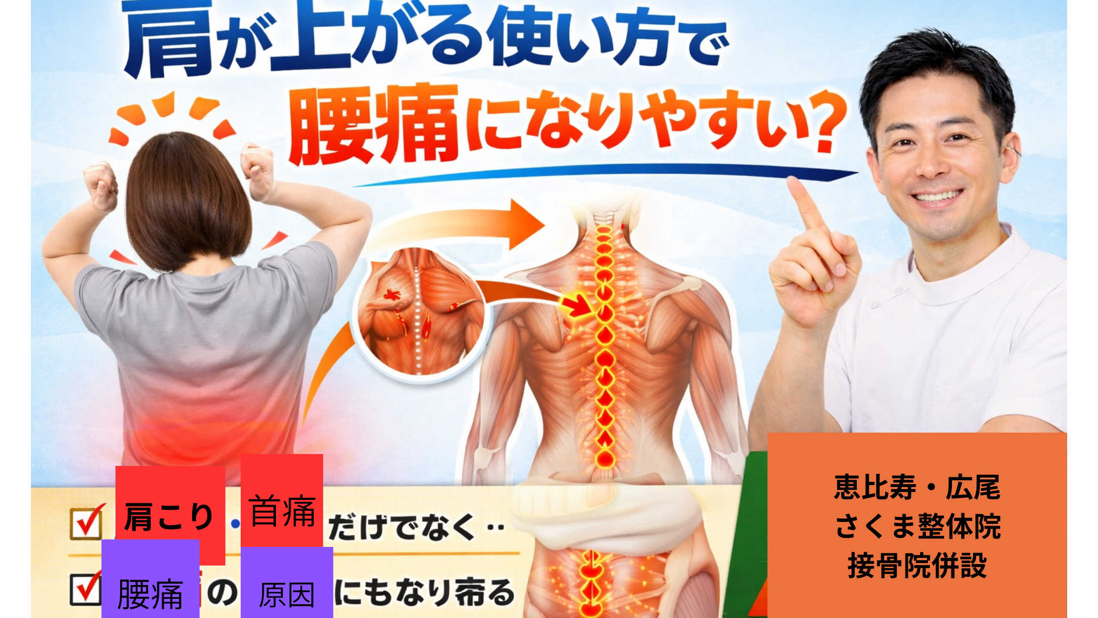 肩が上がる使い方(シュラッグ動作)で腰痛になりやすい?|恵比寿・広尾のさくま整体院(接骨院併設)
