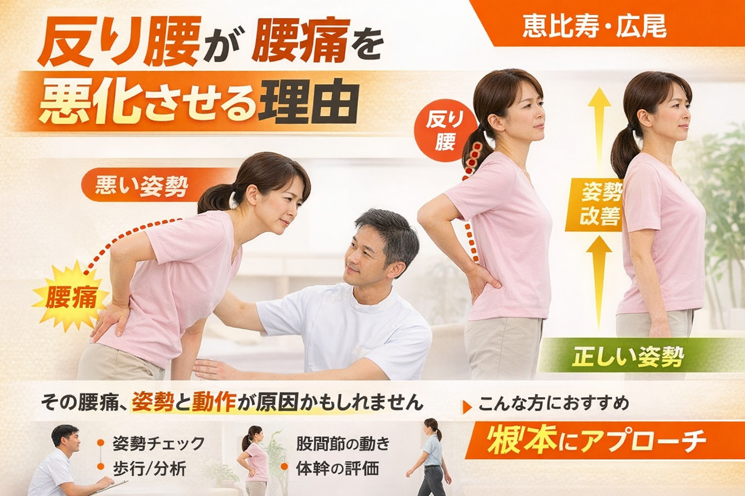 つまり、画像では見つからなくても、身体の動かし方に問題があれば腰へ負担はかかり続けます。恵比寿・広尾エリアでも、デスクワークや運動不足、逆にトレーニング習慣があってもフォームに問題があり、慢性的な腰痛につながっている方は少なくありません。