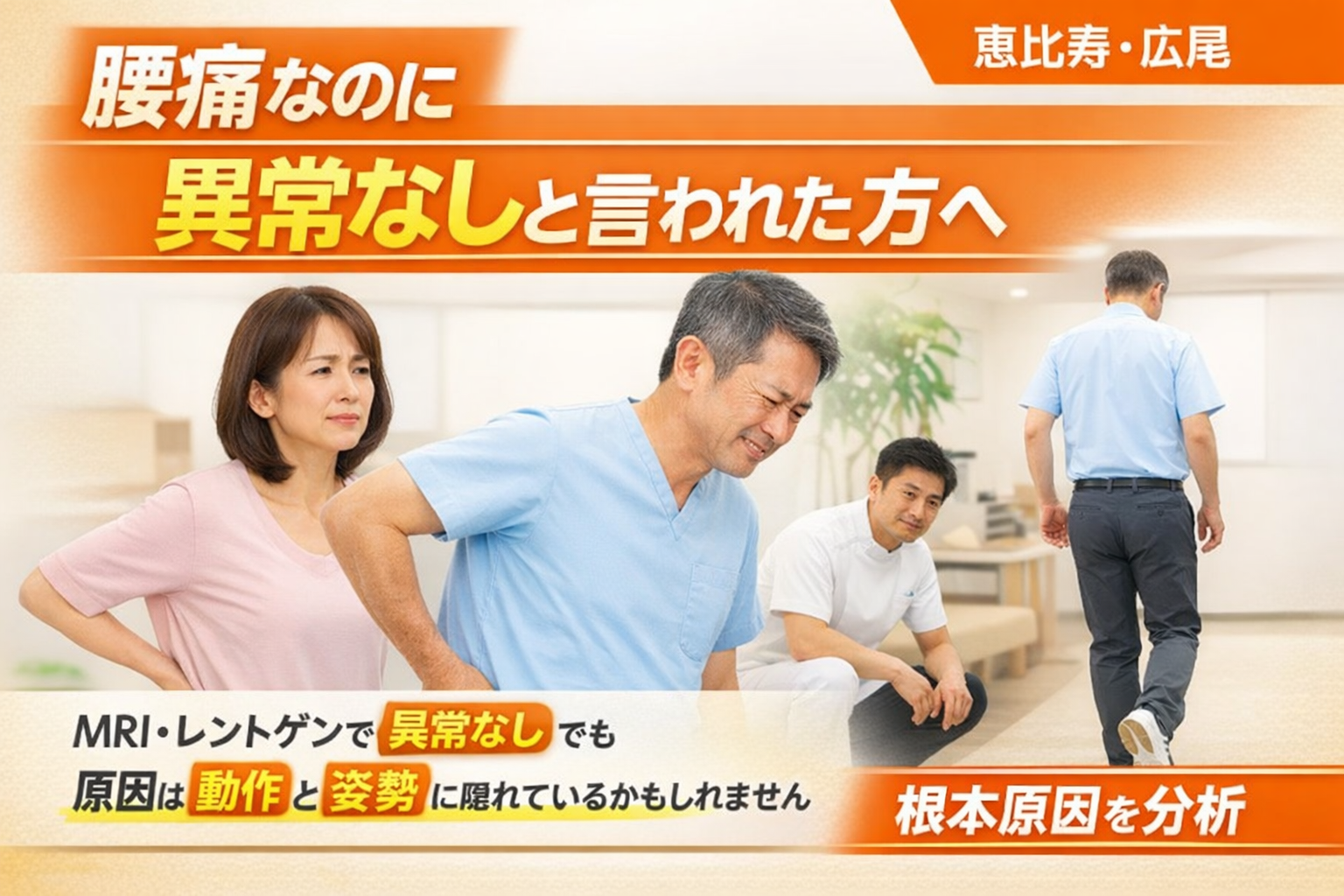 腰痛なのに異常なしと言われた方へ。MRIやレントゲンで異常がないのに痛みが続く場合、原因は姿勢・骨盤・股関節・歩行など
