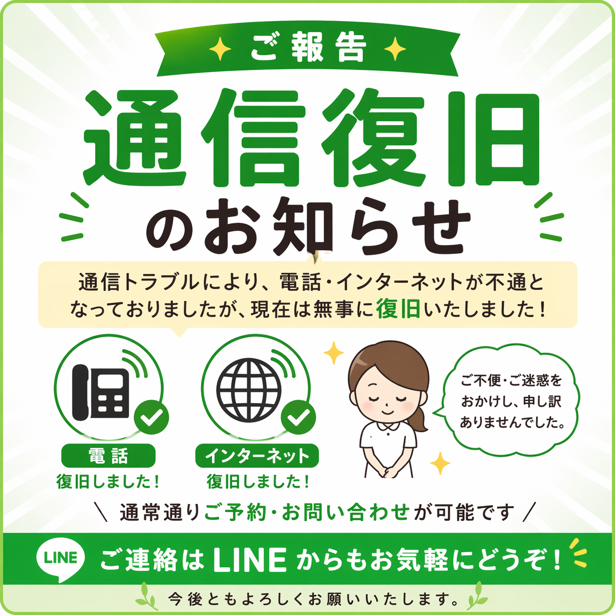 📞電話・🌐インターネットが不通となっておりましたが、